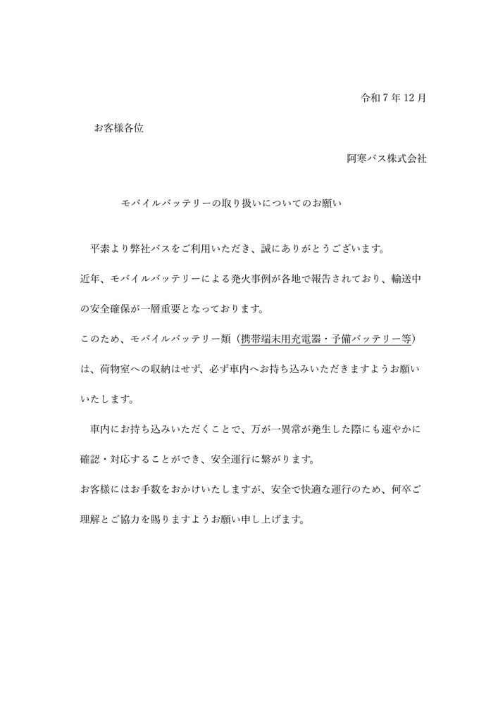 平素より弊社バスをご利用いただき、誠にありがとうございます。